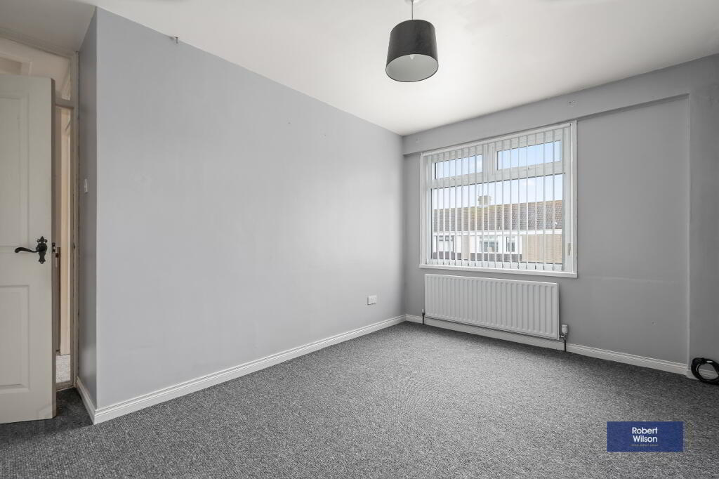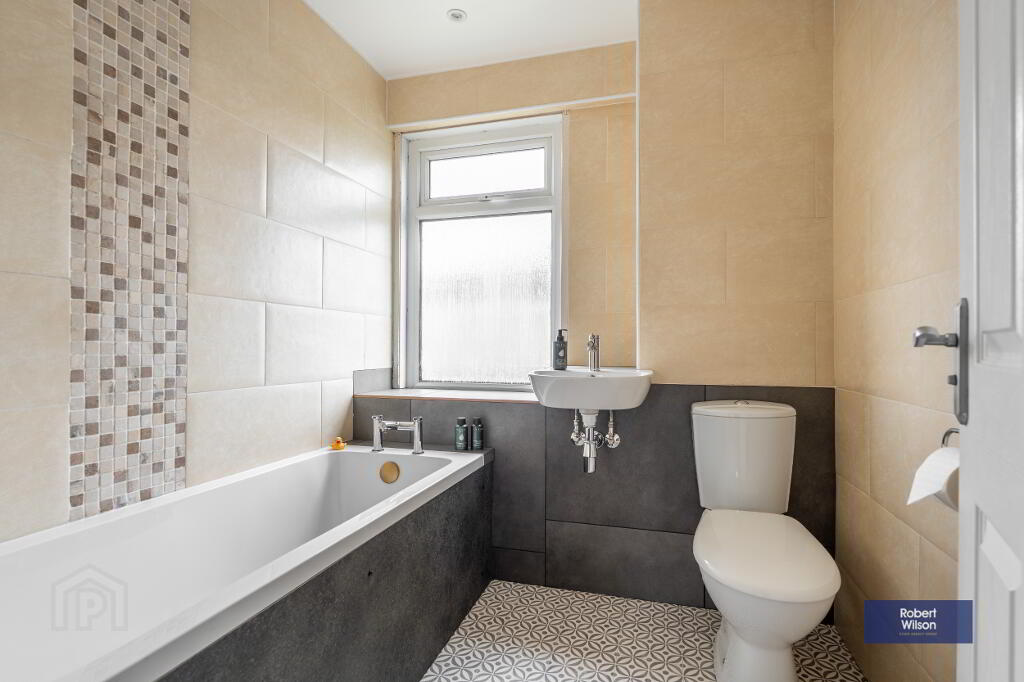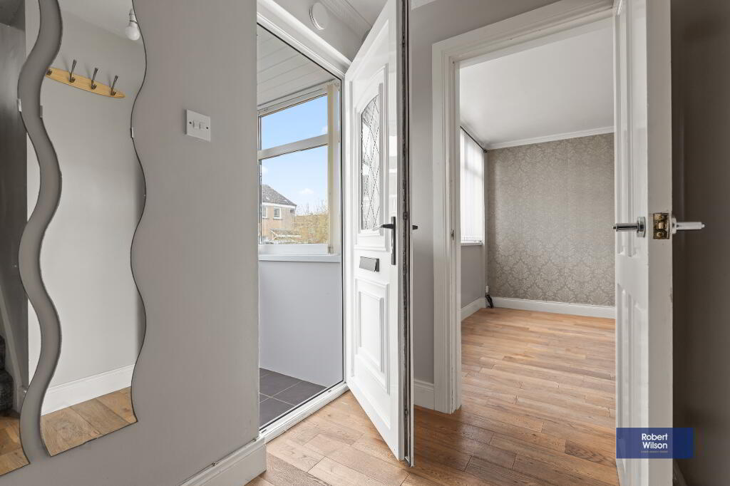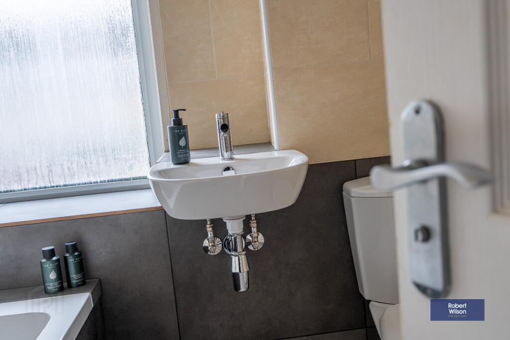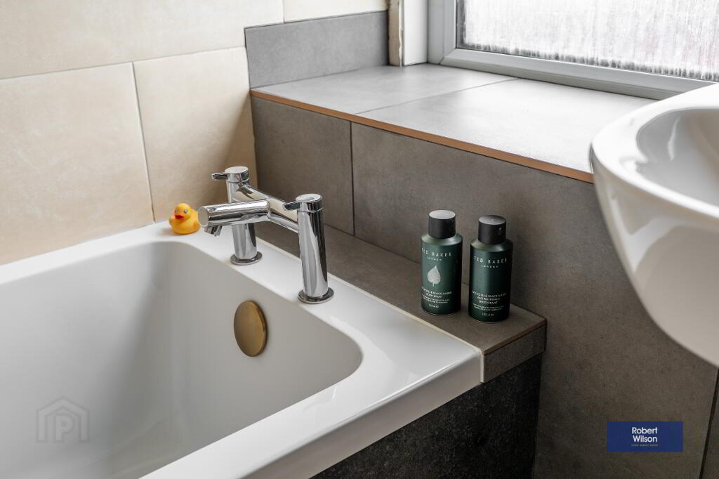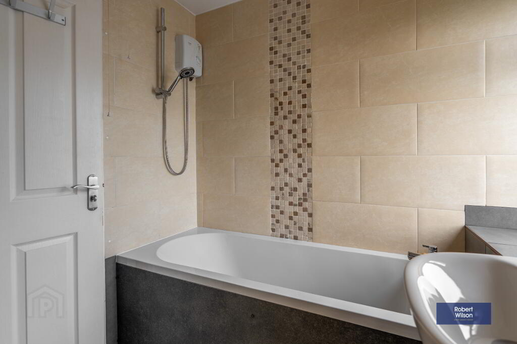 Upstairs, the property boasts three well-proportioned bedrooms, all benefiting from built-in wardrobes. The modern family bathroom has been tastefully refurbished and includes a panel bath with thermostatic shower over, wall-mounted wash hand basin, and low flush WC.