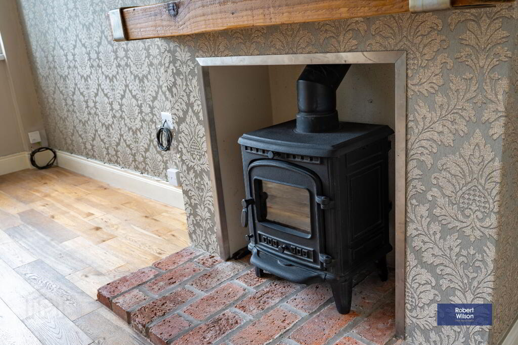 The home welcomes you with a charming brick-built porch leading into a spacious entrance hallway. The living room is both cosy and contemporary, featuring a solid wooden floor, a feature beam fireplace, and a stove set on a brick hearth—perfect for relaxing evenings. Glass-panelled doors lead through to a generous kitchen and dining area, fitted with an integrated hob and oven, and offering ample space for additional appliances. A useful under-stair storage cupboard adds practicality, while a half-glazed uPVC door provides access to the rear garden.