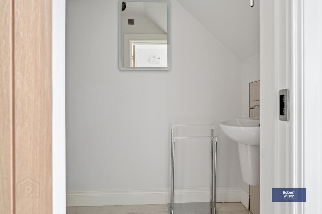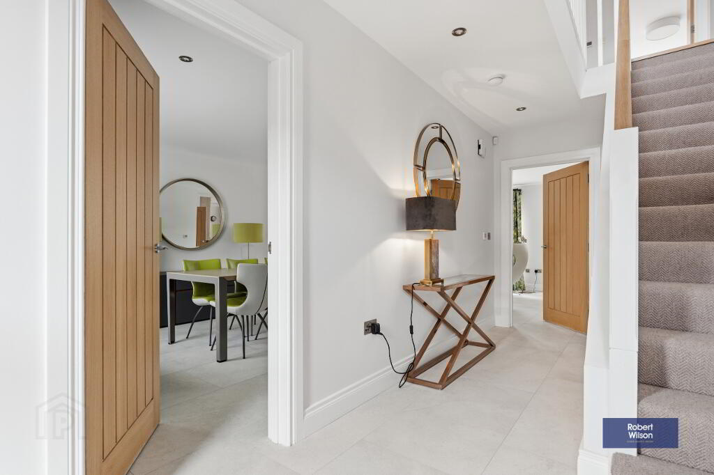 Composite front door with sidelights, staircase to first floor, under stairs storage, W.C., porcelain floor tiles and recessed lighting.