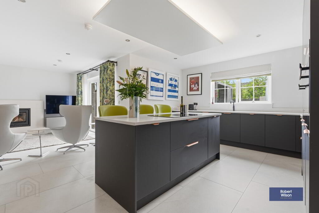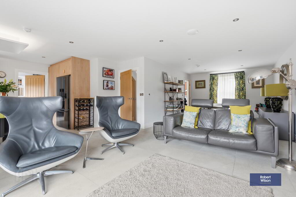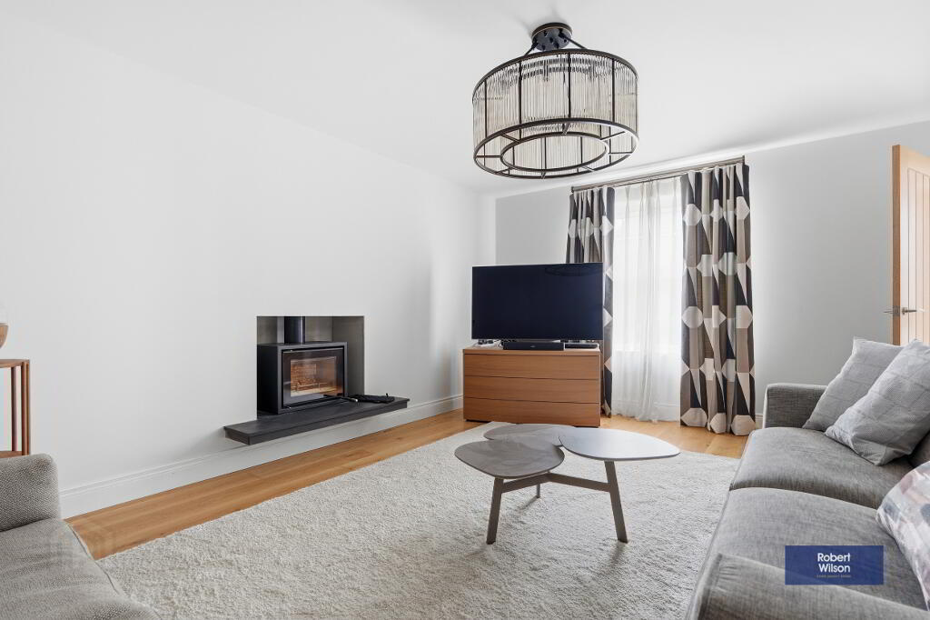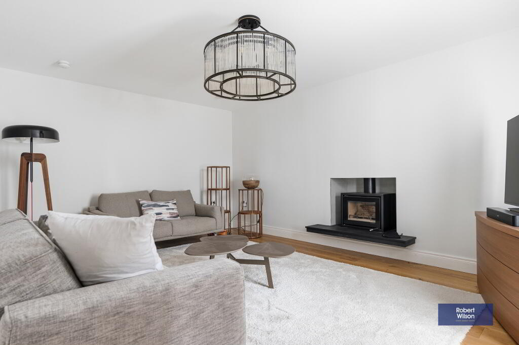The ground floor opens with a striking entrance hall featuring porcelain tiled flooring, recessed lighting, and a convenient downstairs WC. The elegant lounge showcases a stunning suspended log-burning fireplace with a slate hearth, complemented by solid wood flooring. To the rear, the heart of the home is the impressive open plan kitchen, dining, and living area. The bespoke kitchen is fitted with a superb range of units, quartz worktops, premium integrated SMEG appliances, Quooker boiling water tap, and a large island with a Bora venting induction hob. The adjoining dining and living space is equally stylish, centred around a feature stone fireplace with a log-burning stove and enhanced by bi-fold doors opening onto the rear garden.