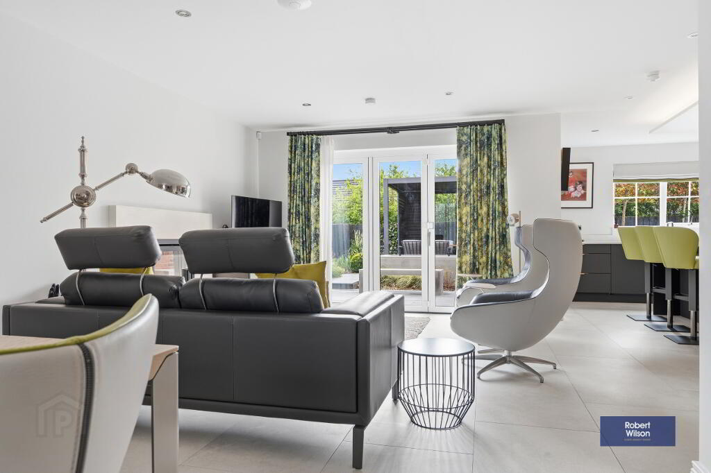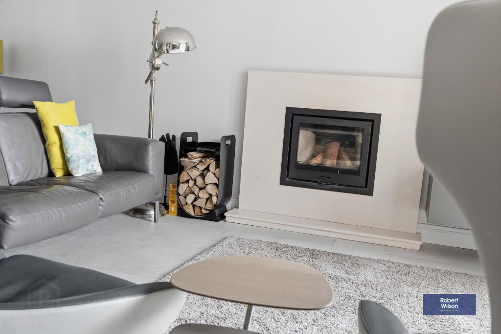 Feature stone fireplace with log burning stove, Bi-Fold doors to rear garden. Porcelain floor tiling and recessed lighting throughout.