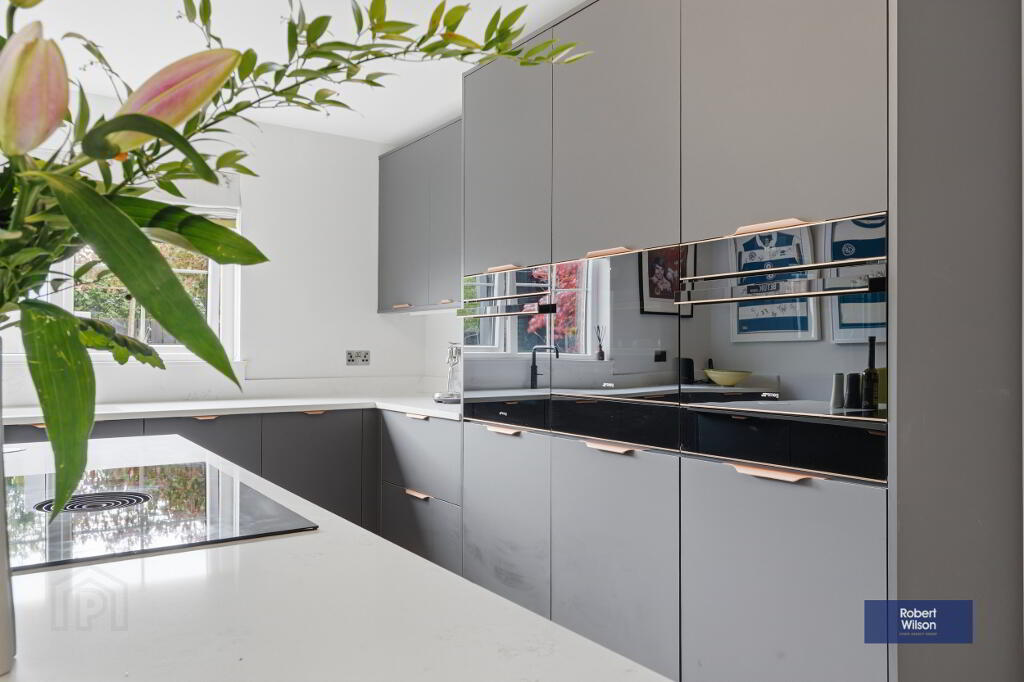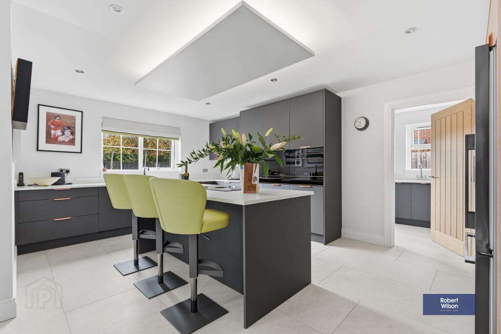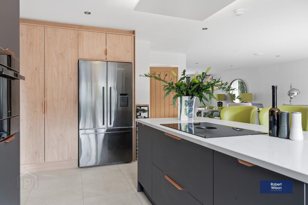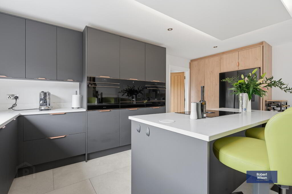 Excellent range of high and low level units with quartz worktop and upstand, 'SMEG' eye level oven, combi oven & microwave, plate warming drawer, wine fridge and wine accessory drawer. Inset sink unit with 'Quooker' boiling water tap, integrated 'SMEG' dishwasher, 'Fisher & Paykel' American style fridge freezer, pantry style cupboards, large island with 'Bora' 4 ring venting induction hob, storage and seating.