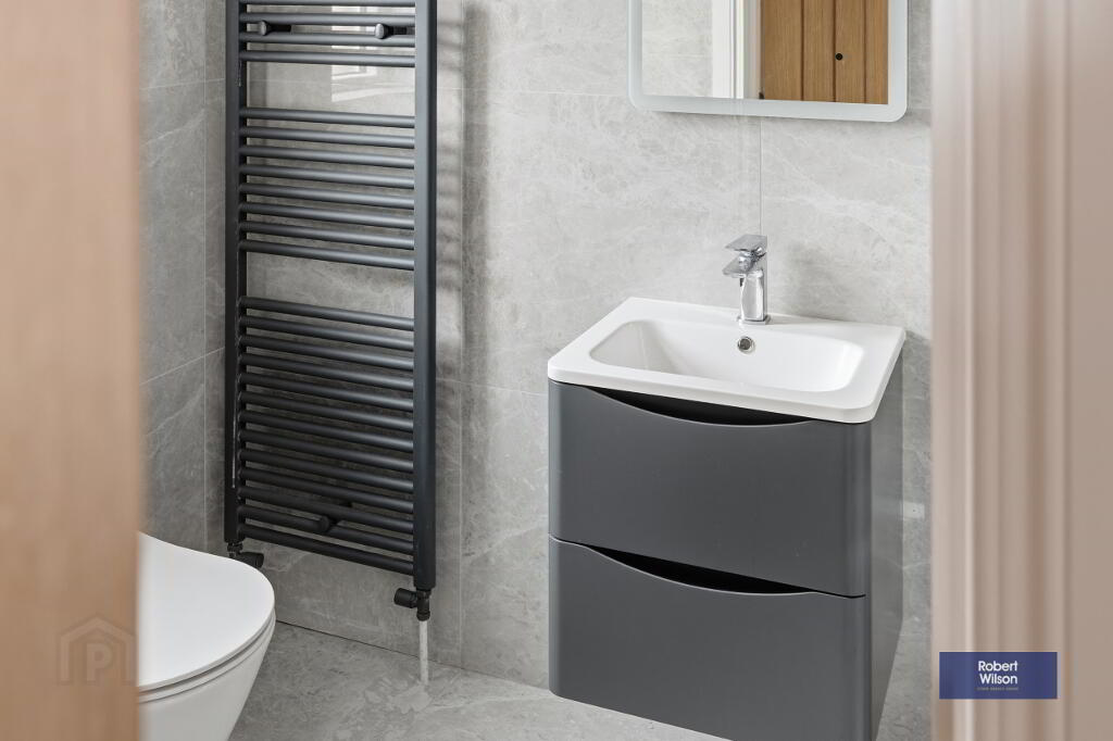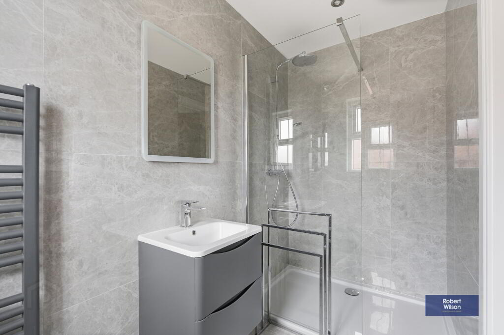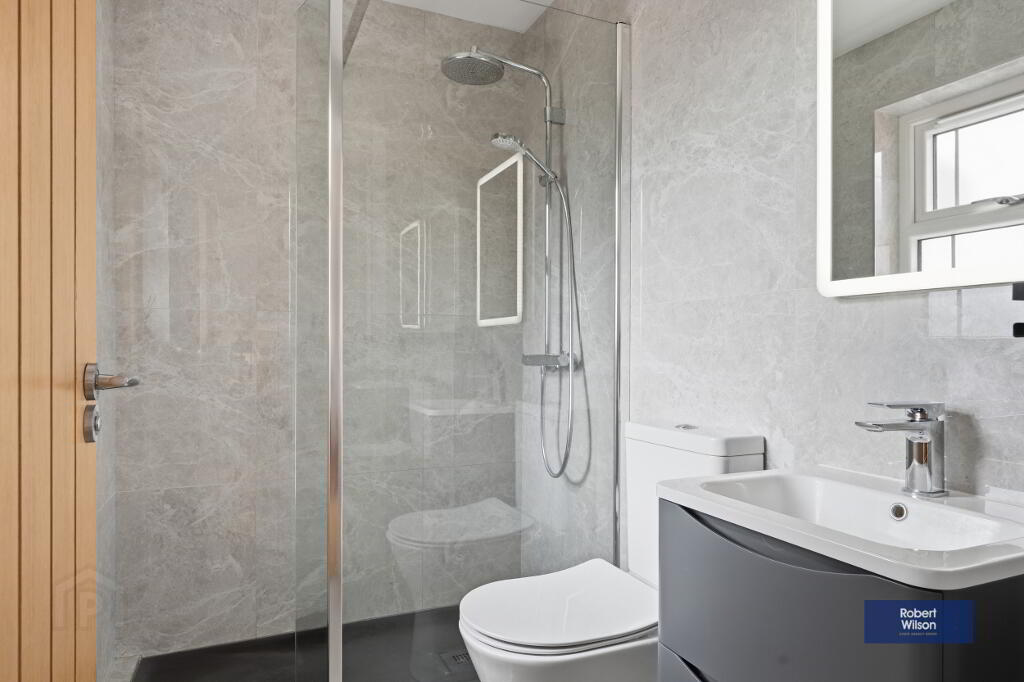 Suite comprising; low flush w.c., vanity incorporated wash hand basin, large walk in shower with thermostatic valve, rainfall and handheld fittings, heated towel rail, fully tiled walls, tiled floor, recessed lighting and extractor fan.