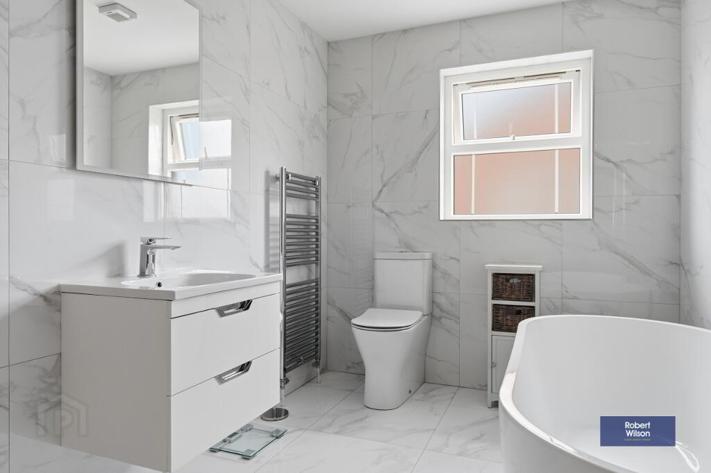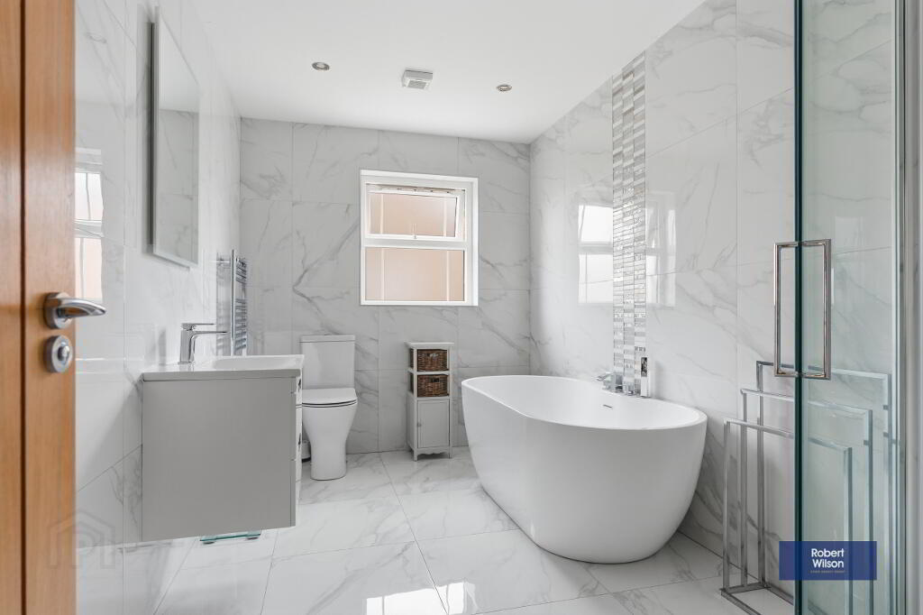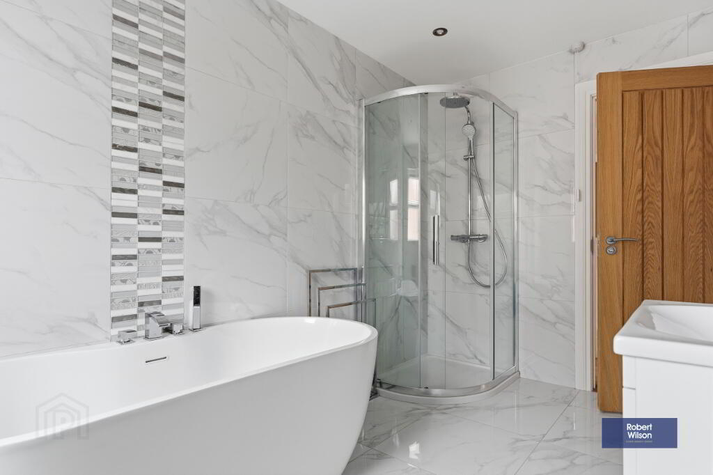 Suite comprising; low flush w.c., vanity incorporated wash hand basin, walk in shower cubicle with thermostatic valve, freestanding bathtub, chrome heated towel rail, fully tiled walls, tiled floor, recessed lighting and extractor fan.