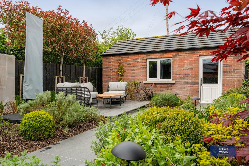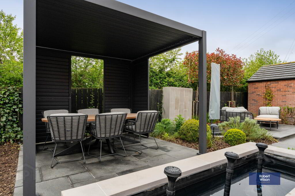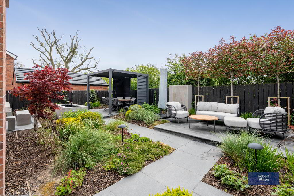 Externally, the home offers a tarmac driveway, landscaped front garden, and a detached garage with electric door, power, light, and an electric vehicle charger. The rear garden is a true standout feature—an oasis of calm with thoughtfully designed landscaping, including a variety of plants, trees, and shrubs, a raised dining area with pergola, water features, and modern conveniences such as outdoor sockets and security cameras.
