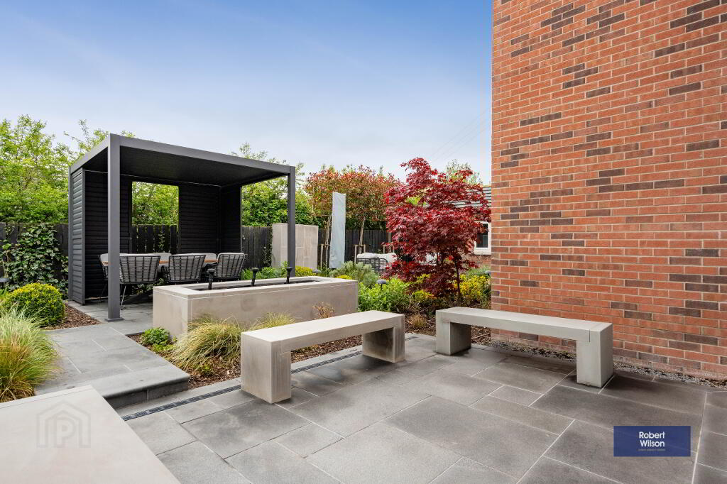 Landscaped rear garden with various plants, trees and shrubs, raised dining are with pergola, water features, side access gates, outside sockets and security cameras.