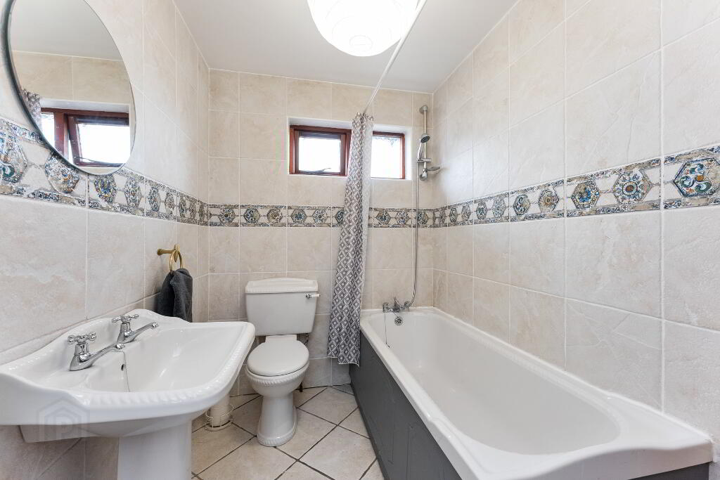 White suite comprising, pedestal wash hand basin, low flush W.C, panelled bath tub with shower overhead, fully tiles walls, tiled floor, extractor fan.
