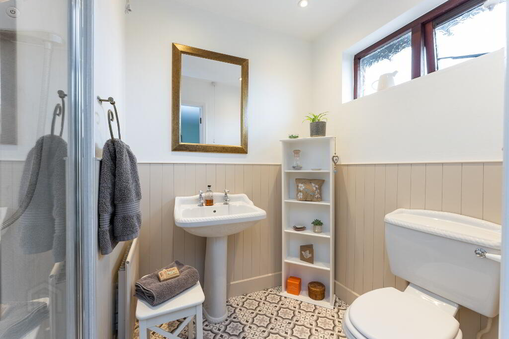 White suite comprising; pedestal wash hand basin, low flush W.C, walk in shower cubicle with 'Mira Sports' power shower, wall panelling, recessed lights, extractor fan.