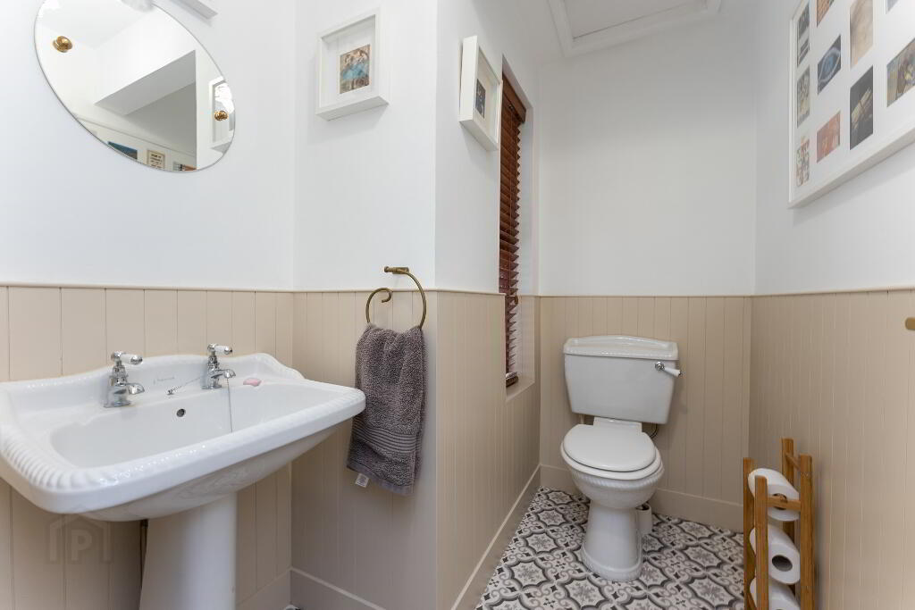 Pedestal wash hand basin, low flush W.C, wall panelling.