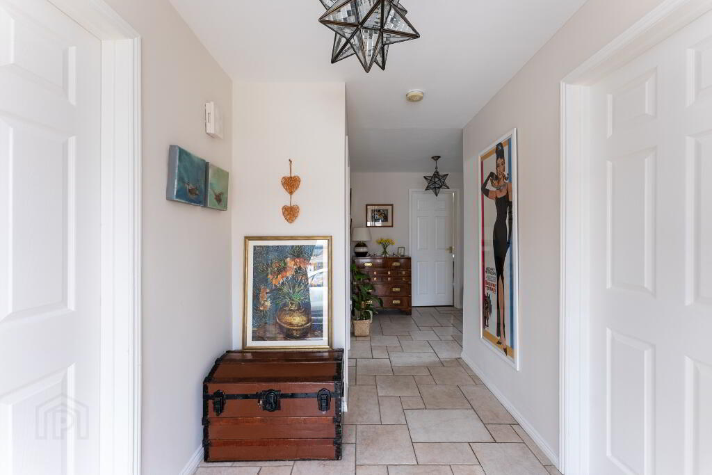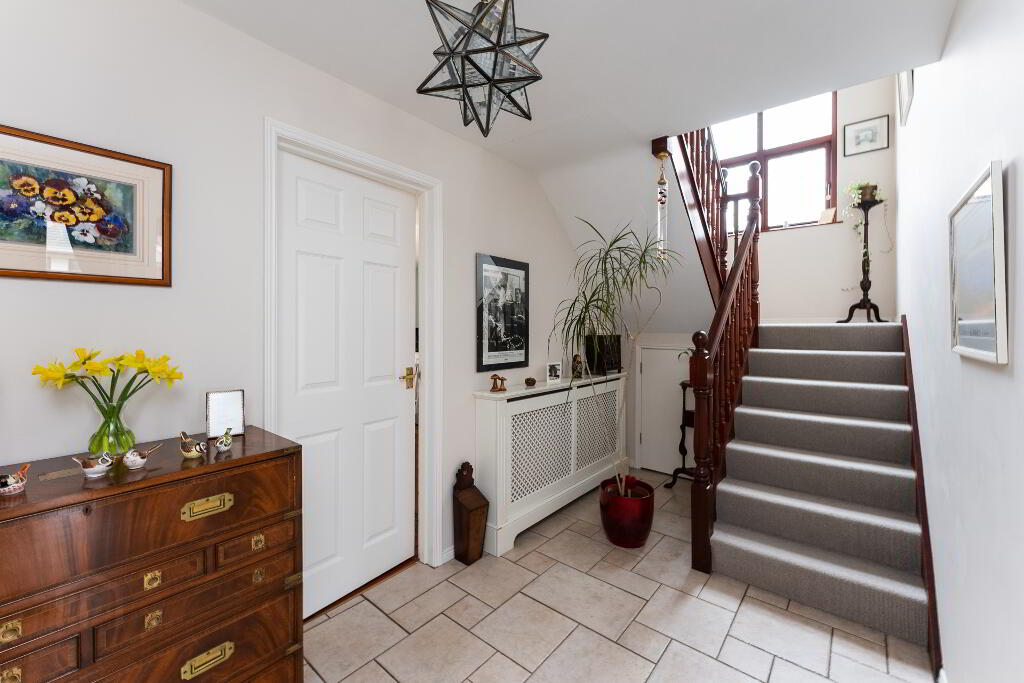 Hardwood entrance door with glazed side lights, tiled flooring, stairs leading to first floor.