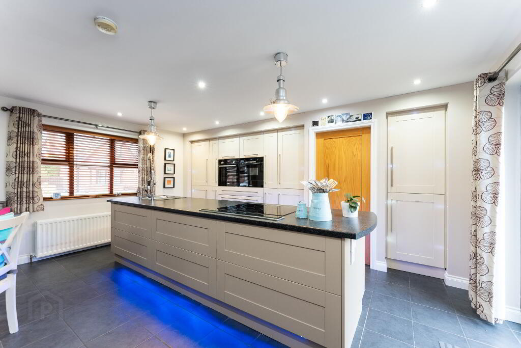 Excellent fitted kitchen with range of high and low level units, centre island with laminate worktops, stainless steel sink unit, boiler tap, mixer tap, pull out spray tap, 4 ring ceramic hob, recessed extractor fan, 'Bosch' integrated dishwasher, integrated 'Smeg' freezer, integrated full length 'Smeg' fridge, built in 'Bosch' oven, built in 'Bosch' combi oven, warming drawer. Pull out larder cupboards, pull out pot drawers, glazed display units, wine rack, corner storage units, down lighting and double patio doors to rear patio.