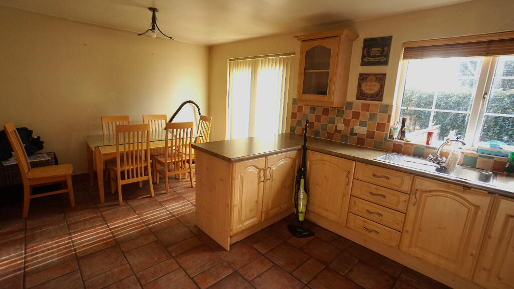 5.51m x 3.28m (18' 1" x 10' 9") Range of high and low level units, electric hob with extractor over, single oven, integrated fridge freezer, stainless steel sink unit with stainless steel mixer tap, tiled floor, part tiled walls, patio doors to rear garden.