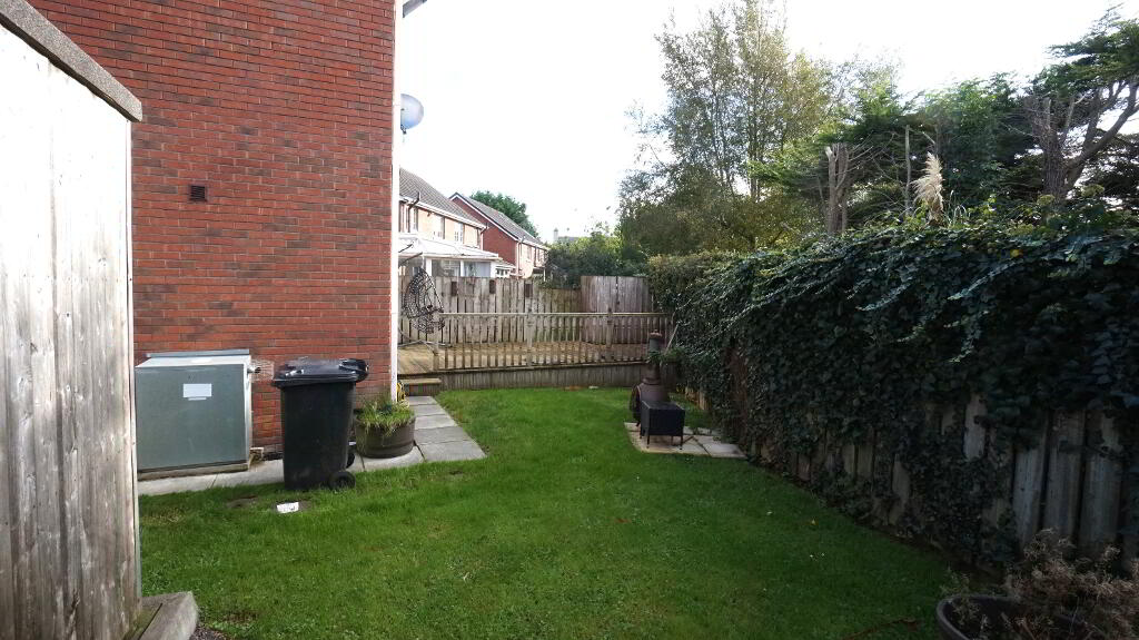 Rear garden with raised decking area, fully enclosed with side access. Front garden in lawn and tarmac driveway.