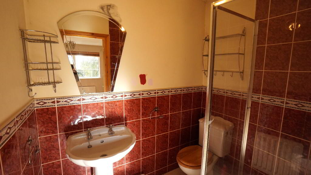 1.98m x 1.54m (6' 6" x 5' 1") White suite comprising; pedestal wash hand basin, chrome taps, low flush w.c., part tiled walls, tiled floor, walk in shower cubicle with thermostatic valve shower, large built in wardrobe.