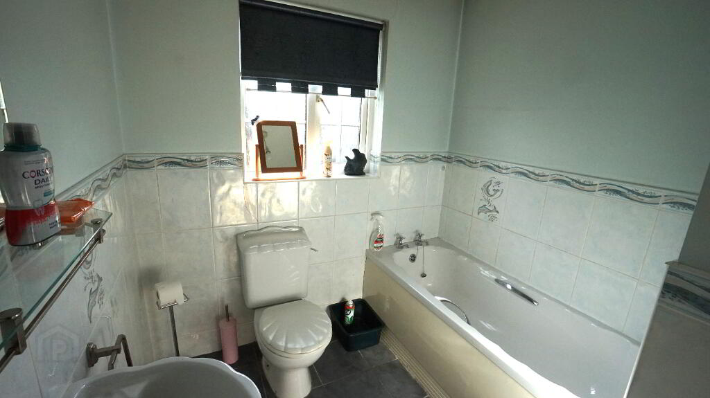 White suite comprising; Pedestal wash hand basin, low flush w.c., panel bath, part tiled walls, tiled floor.