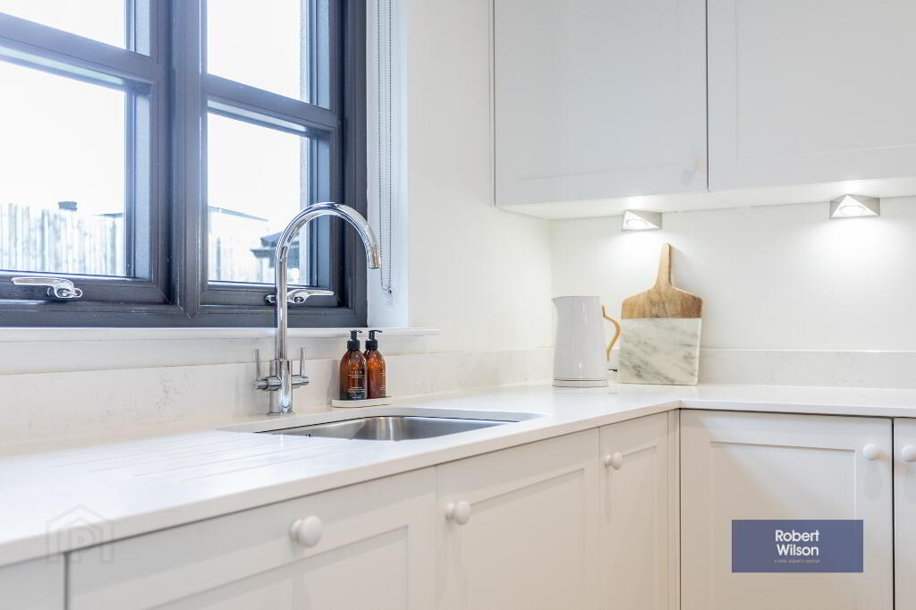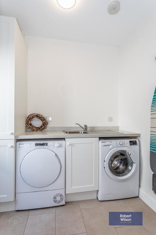 Range of high and low level units to match kitchen, space and plumbed for washing and tumble dryer, stainless steel sink unit, housing gas boiler, tiled flooring, extractor fan, composite door to rear.