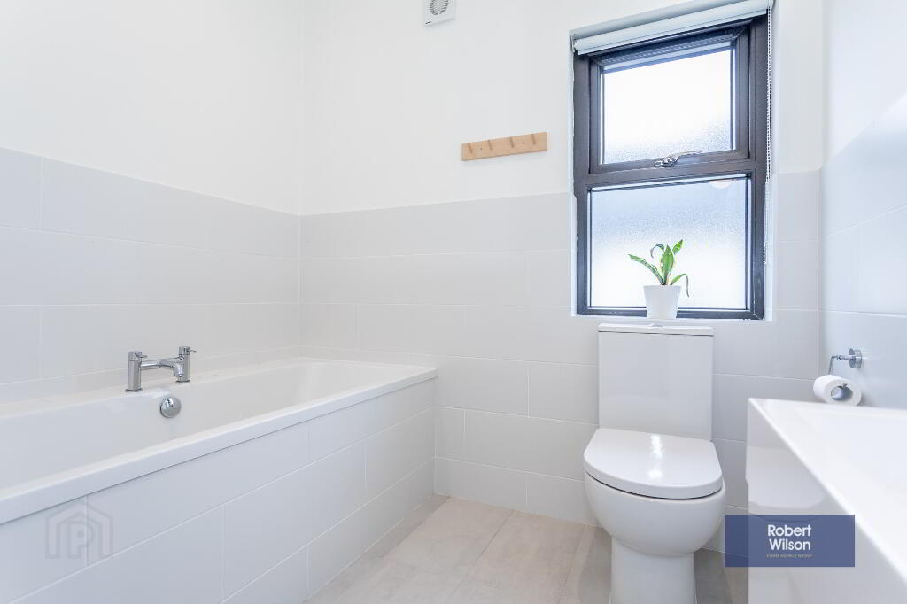 White suite comprising; wash hand basin with vanity incorporated, bath tub, low flush W.C, walk-in shower cubicle with rainfall fitting, chrome heated towel rail, half tiled walls, tiled flooring, extractor fan, recessed lighting.