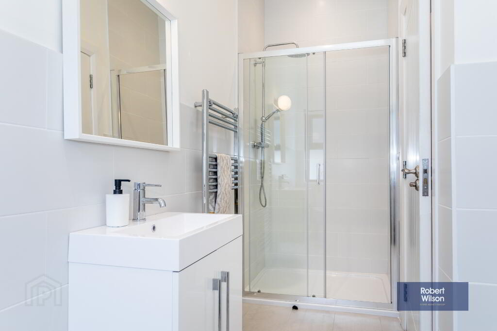 White suite comprising; wash hand basin with vanity incorporated, low flush W.C, large walk-in shower cubicle with rainfall fitting, recessed lighting, extractor fan, part tiled walls, tiled flooring, chrome heated towel rail.