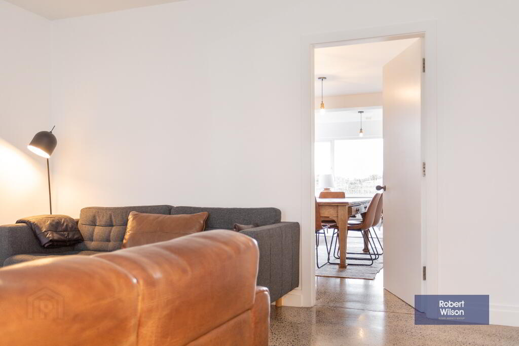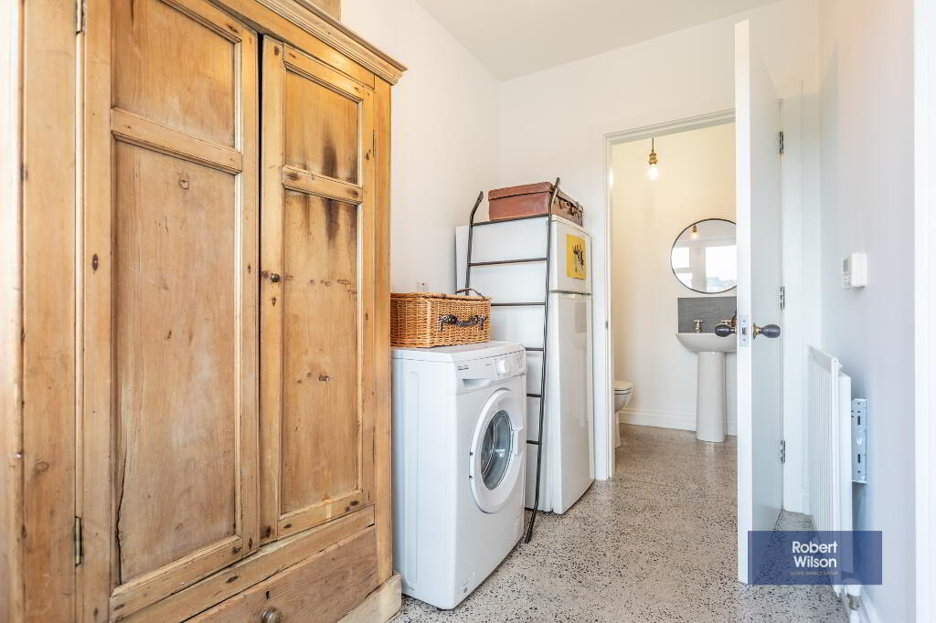 As you step into the ground floor, the polished concrete floor of the entrance hall sets the tone for the sleek design that defines the entire property. The lounge, with a wood-burning stove and polished concrete floor, provides a cozy retreat with a touch of urban sophistication. A cupboard off the lounge ensures ample storage space, maintaining the property's clean and minimalist aesthetic.