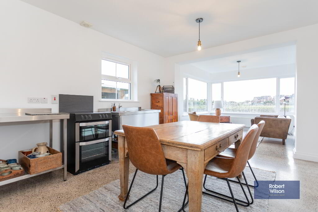 The kitchen/dining area features an industrial freestanding stainless steel kitchen equipped with a double oven and ceramic 4-ring hob. The polished concrete floor adds an industrial edge, while double panel radiators ensure a comfortable atmosphere for both cooking and dining. The sunroom allows light to flood the space and has beautiful country and garden views. The utility room, with plumbing for a washing machine, offers practicality and convenience with access to the rear garden.