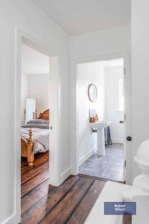 The first floor boasts reclaimed floorboards, adding character and warmth to the spaces. The main bedroom exudes contemporary charm with reclaimed floorboards. The bathroom is a sanctuary of modern luxury, showcasing a white suite, a large walk-in shower and stylish part-tiled walls.