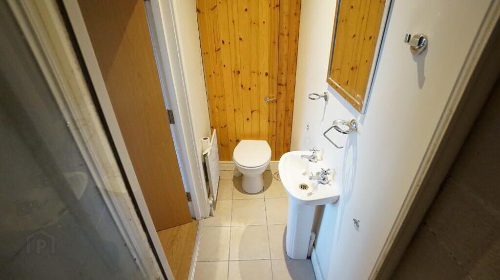 White suite comprising; pedestal wash hand basin, walk in shower cubicle, low flush W.C, tiled flooring, recessed lighting, extractor fan.