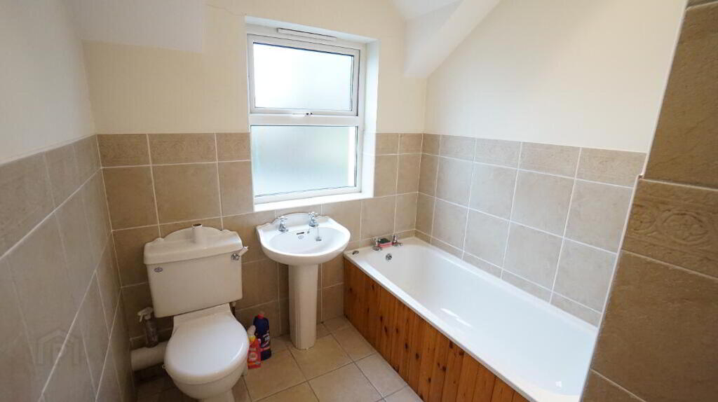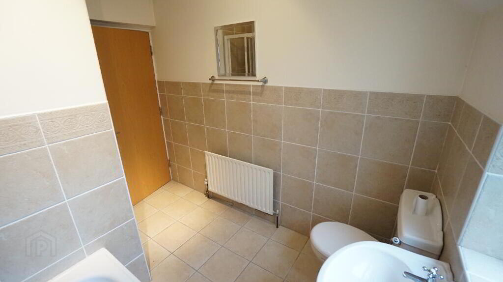 White suite comprising; pedestal wash hand basin, low flush W.C, panelled bath tub, walk-in shower cubicle with 'Aqualisa' electric shower, tiled flooring, part tiled walls, recessed lighting, extractor fan.