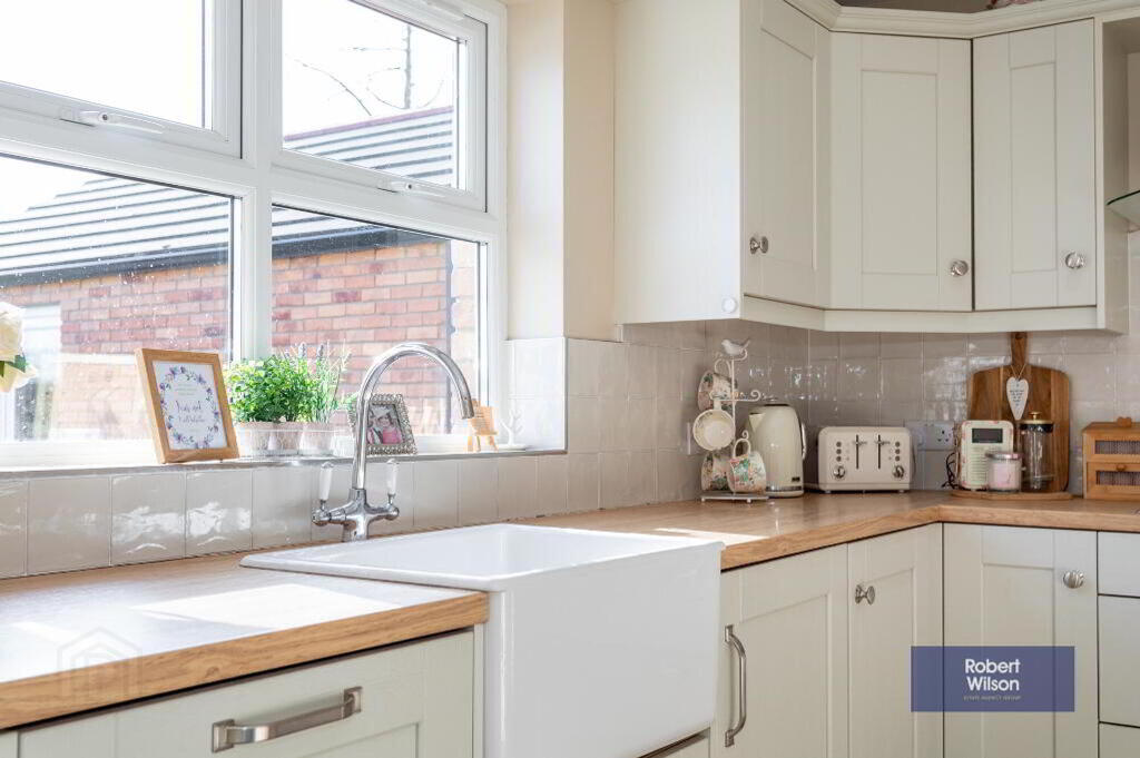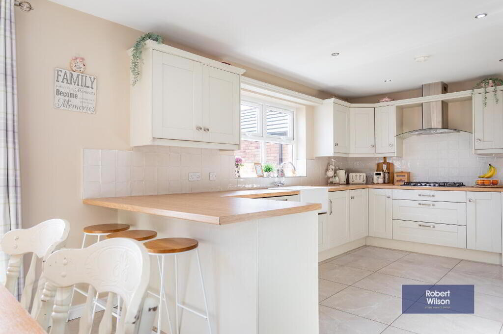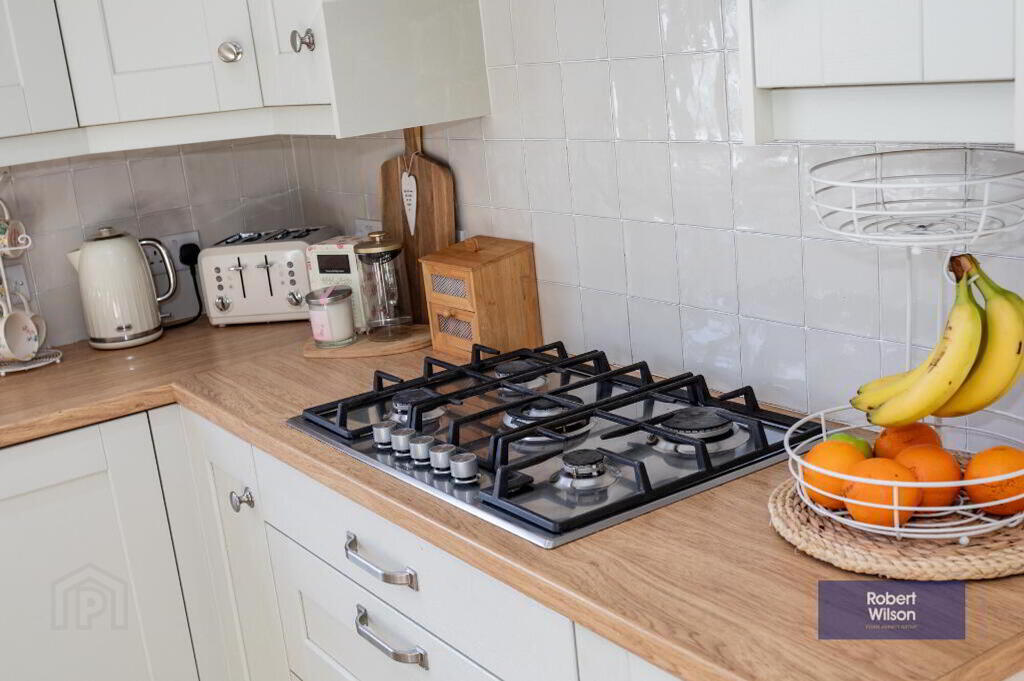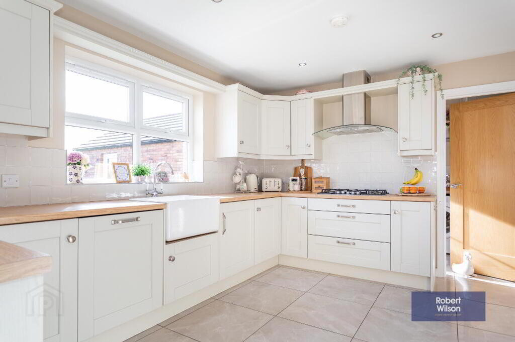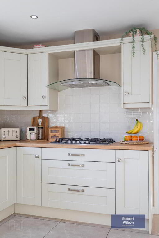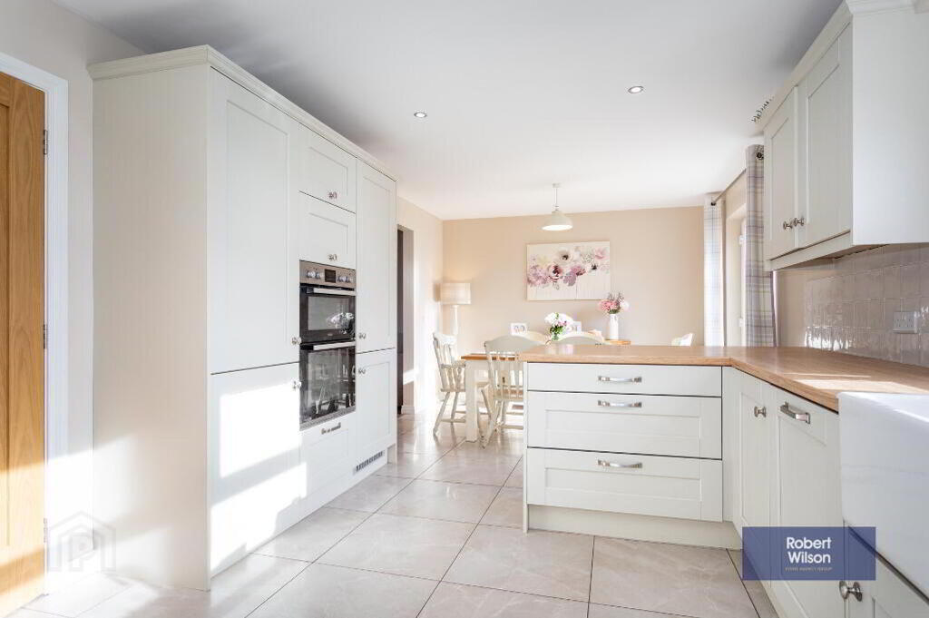 Good range of high and low level units, laminate worktops, inset 'Belfast' sink unit with chrome mixer tap, integrated dishwasher, double eye level oven, integrated fridge freezer, 5 ring gas hob and extractor over, tiled floor , part tiled walls, recessed lighting.