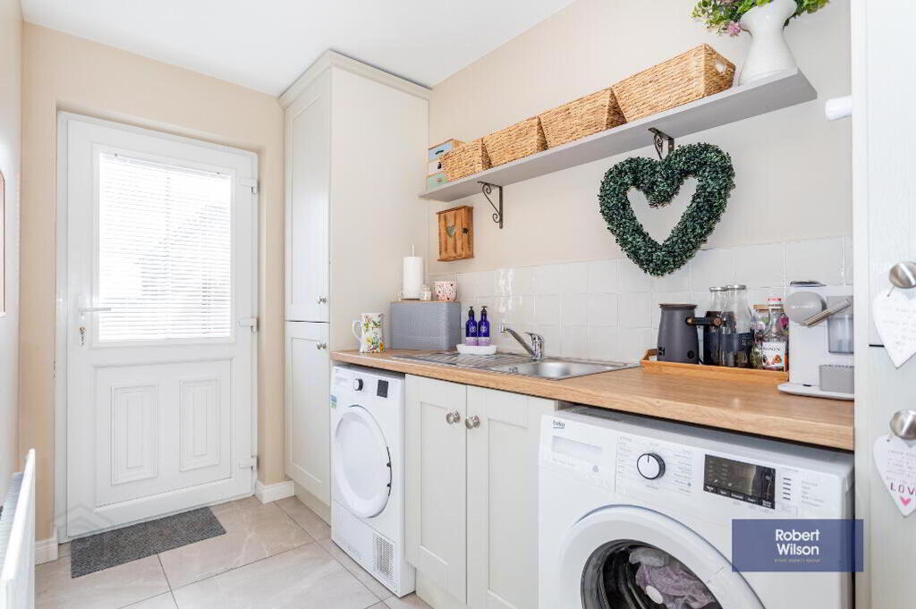 1.73m x 3.27m (5' 8" x 10' 9") Range of high and low level units, stainless steel sink unit with chrome mixer tap, space for tumble dryer and washing machine, extractor fan, single panel radiator, tiled floor, PVC rear door with glazed panel, cupboard housing gas boiler.