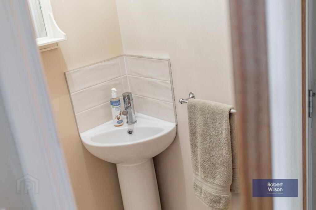 White suite comprising; low flush wc, pedestal wash hand basin with chrome mixer tap, extractor fan and tiled floor.