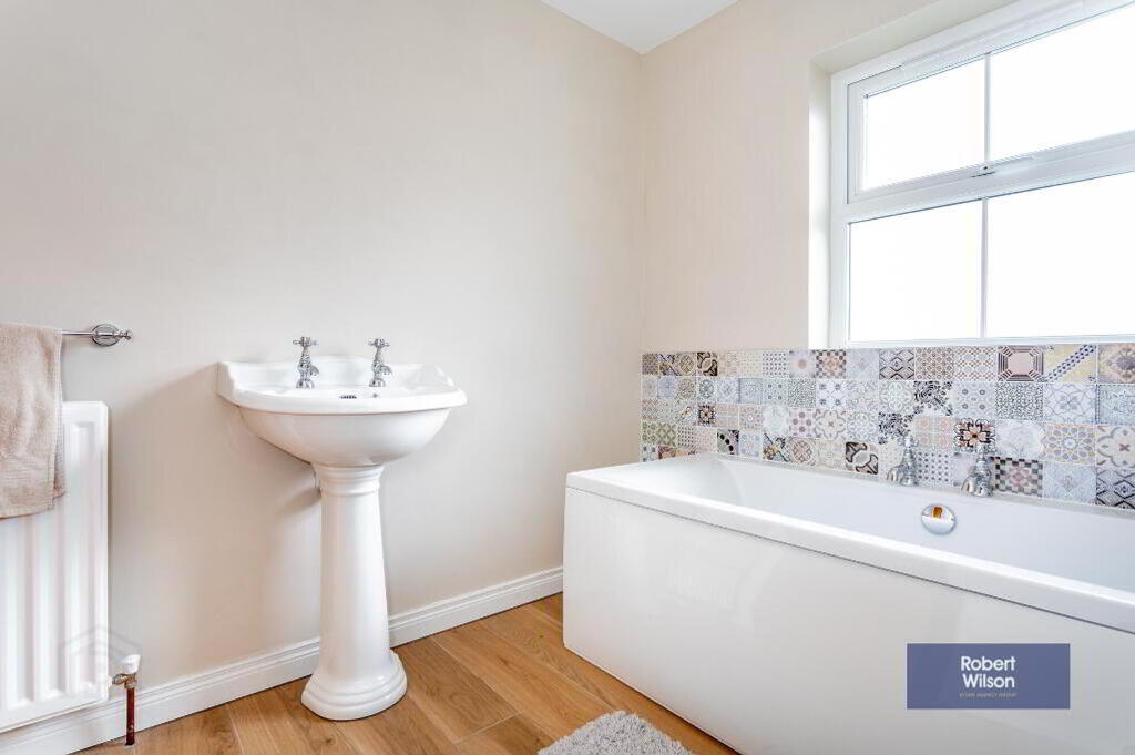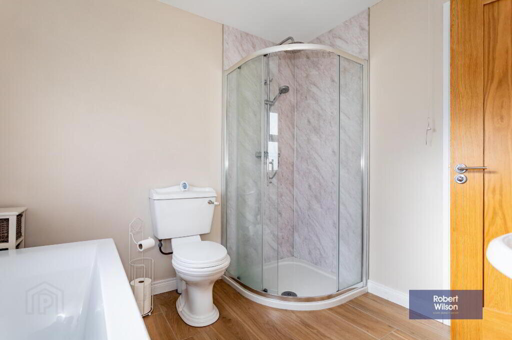 2.53m x 2.42m (8' 4" x 7' 11") White suite comprising; pedestal wash hand basin with chrome taps, panel bathtub with chrome taps, low flush wc. walk in shower cubicle with thermostatic valve rainfall and handheld fittings, tiled floor, part tiled walls, extractor fan, recessed lighting.