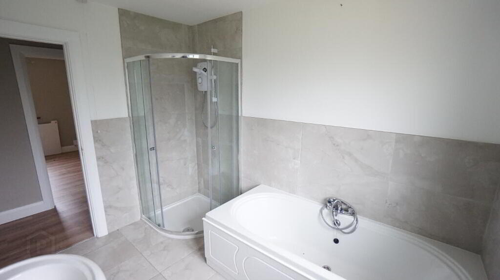 White suite comprising; walk-in shower cubicle with Mira Sport shower over, pedestal wash hand basin, panelled bath tub, low flush W.C, part tiled walls, tiled flooring, extractor fan.