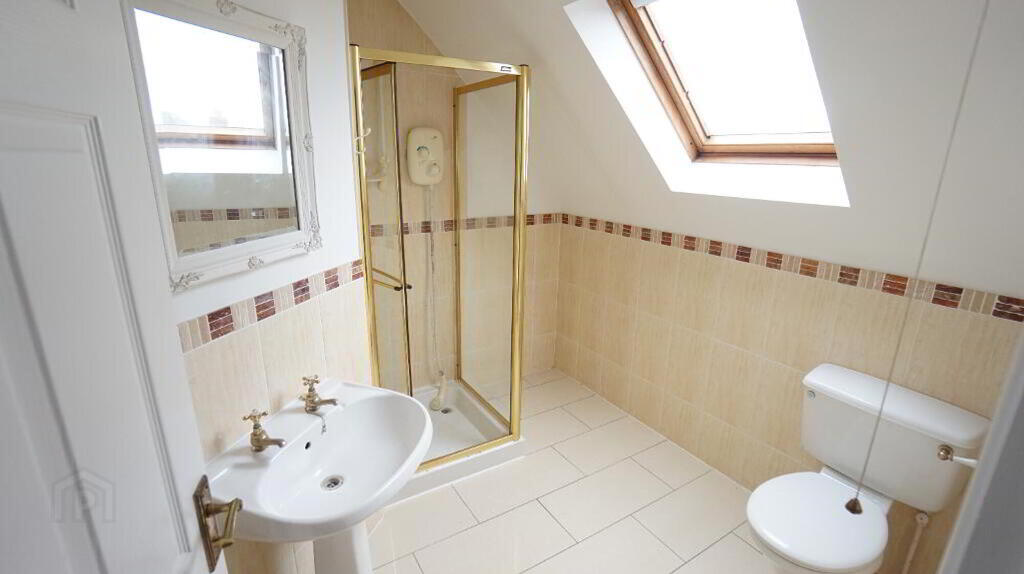 White suite comprising; walk-in shower cubicle, pedestal wash hand basin, low flush W.C, tiled flooring, part tiled walls, extractor fan, velux roof light.