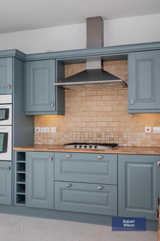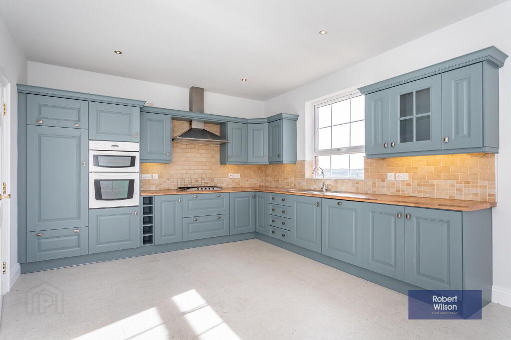 7.2m x 3.8m (23' 7" x 12' 6") Fitted kitchen with excellent range of high and low level units with laminated work tops, 1½ bowl stainless steel sink unit with mixer taps. Tiled splash back, 5 ring gas hob, extractor hood , stainless steel double oven, Integrated fridge/ freezer, Integrated dishwasher. Tiled floor. Recessed down lighting. Archway to sun lounge. Lovely view over the Lagan valley.