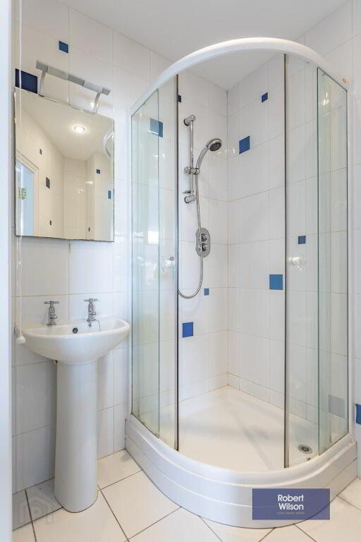 White suite comprising low flush w.c., Pedestal wash hand basin . Large walk in mains fed shower. Fully tiled walls, tiled floor. Extractor fan , Recessed lighting.
