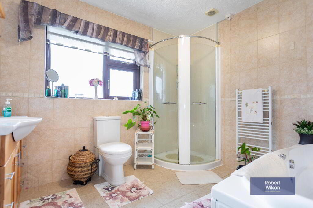 2.7m x 3m (8' 10" x 9' 10") White suite comprising low flush w.c., wash hand basin with vanity unit incorporated, jacuzzi panelled bath & jacuzzi walk in shower cubicle. Fully tiled walls ,tiled floor. Extractor fan.