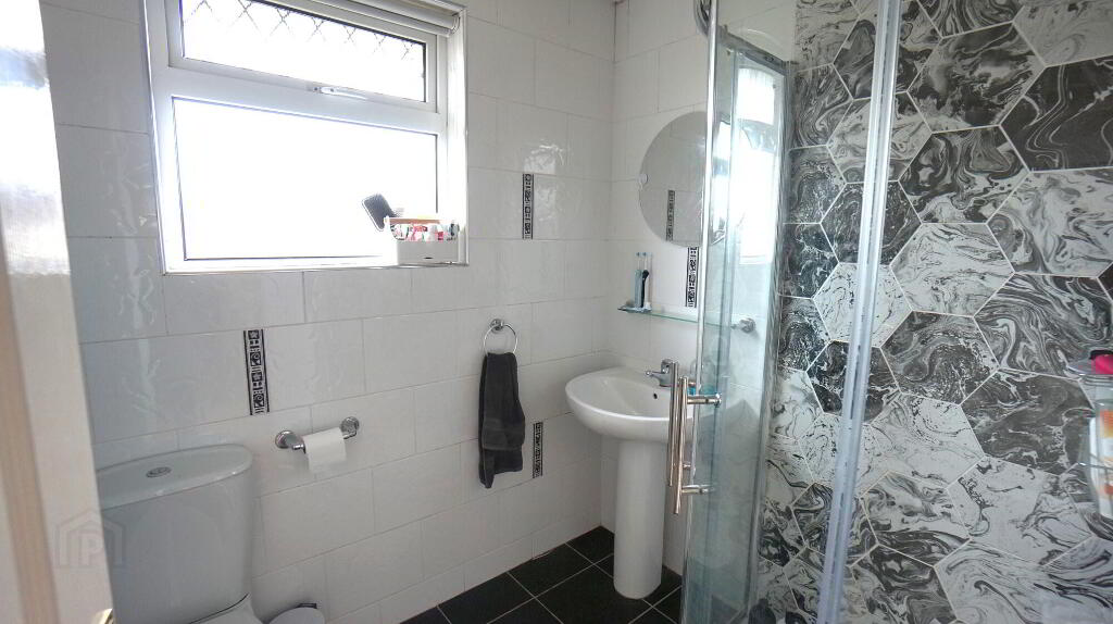 Modern white coloured suite comprising of low flush WC, pedestal wash hand basin with chrome mixer tap and large corner glass shower enclosure. Fully tiled walls, chrome heated towel rail, tiled floor, recessed low voltage down lights, built in hot press.