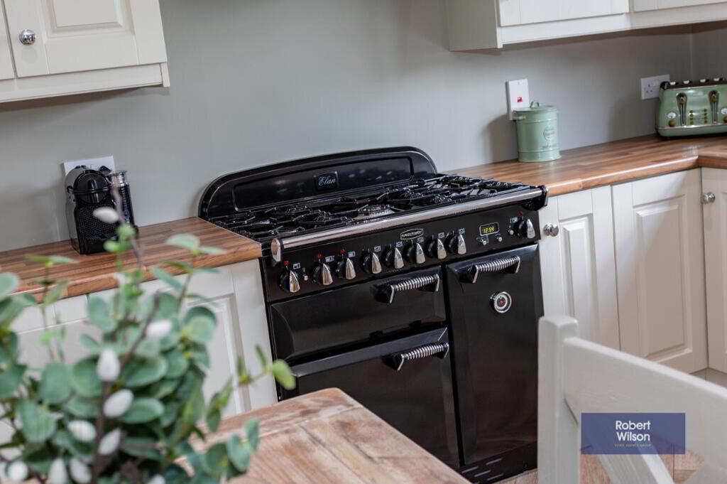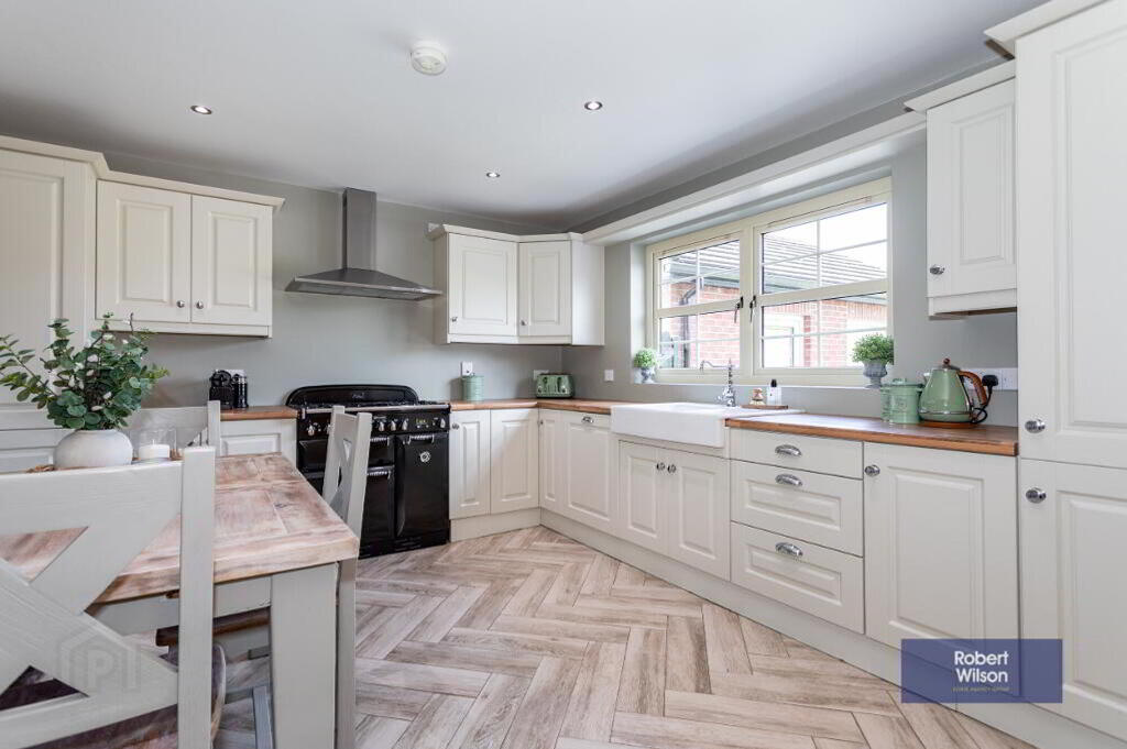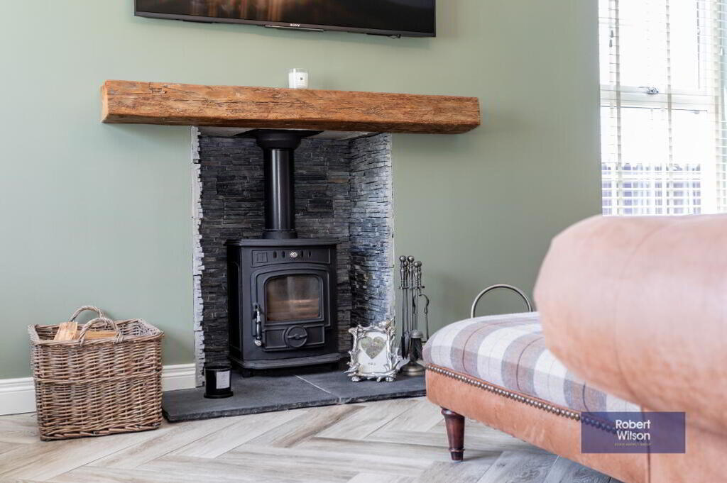 The spacious lounge offers a cozy atmosphere with a stove, featuring a stone hearth, and an oak mantle. The modern kitchen boasts an impressive range of shaker-style units in a mussel finish, integrated appliances, a double Belfast sink, and recessed lighting complemented by a practical utility room with additional storage and appliance space.