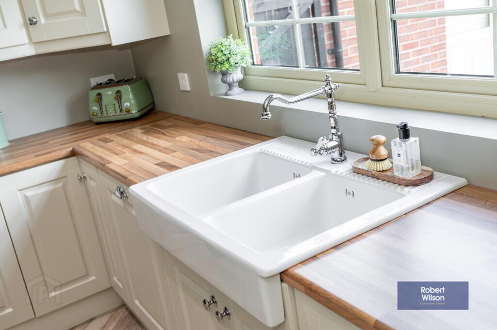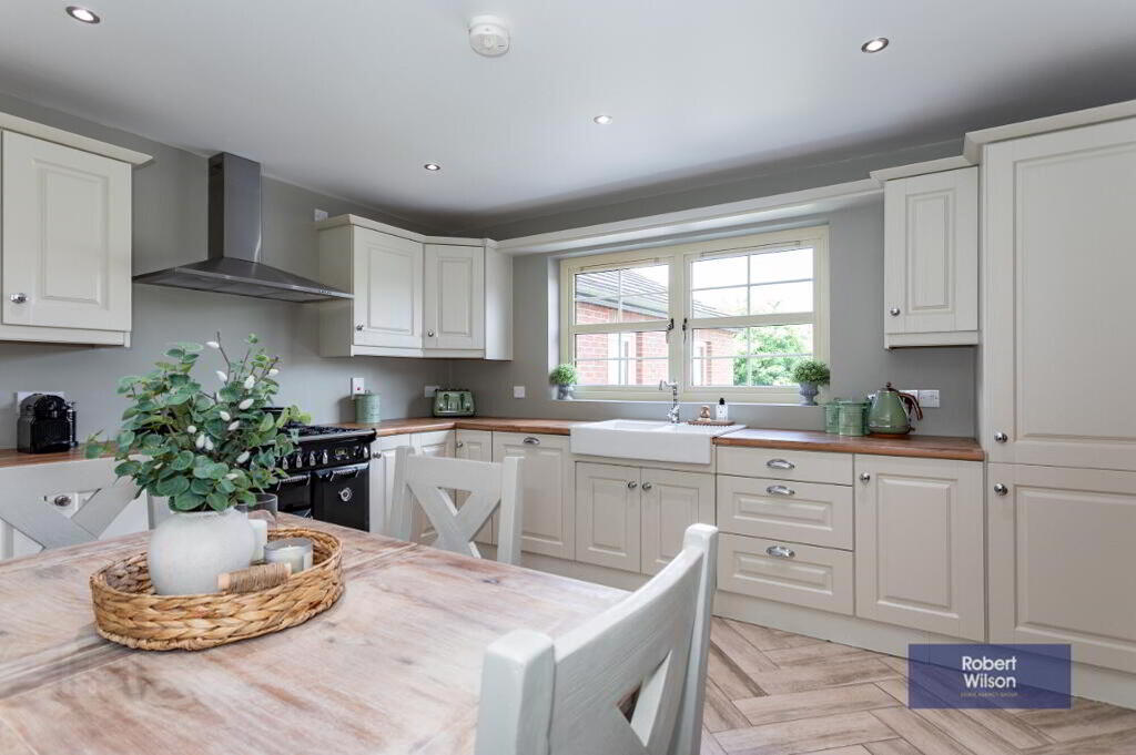 4.72m x 3.72m (15' 6" x 12' 2") Excellent range of high & low level units in a mussel suite, shaker style finish, integrated dishwasher, integrated fridge/freezer, space for a Rangemaster, canopy extractor fan, Belfast sink, recess lights
