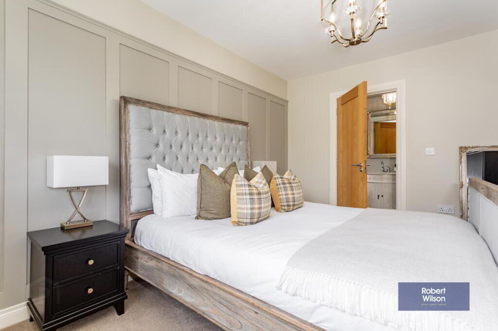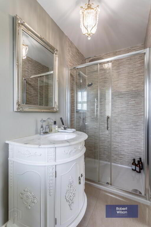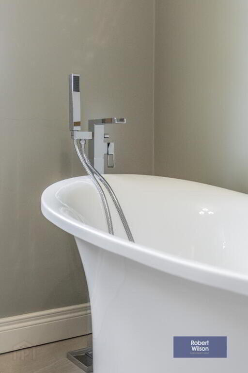 Upstairs, the landing provides access to the fully floored attic and a handy storage cupboard. The master bedroom boasts an attractive panelled wall, luxurious en-suite with a large walk-in shower cubicle, W.C and wash hand basin. Two additional bedrooms, offering ample space and comfort. The well-appointed bathroom features a freestanding bath with a modern waterfall freestanding tap and a chrome heated towel rail, with marble tiled flooring.