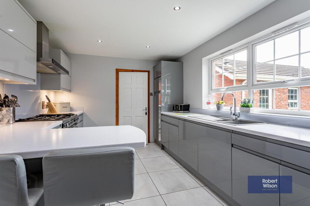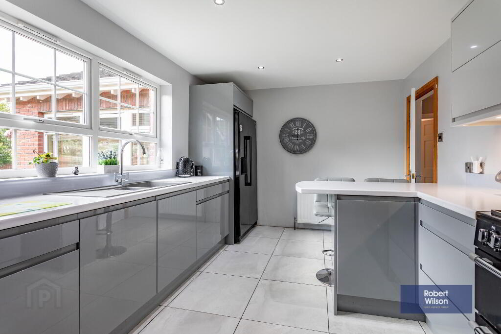 2.98m x 4.7m (9' 9" x 15' 5") Excellent range of high and low level units, space for range style cooker, extractor over, laminate worktop, stainless steel sink unit with mixer tap, space for American style fridge freezer, tiled floor, double panel radiator, recessed lighting.