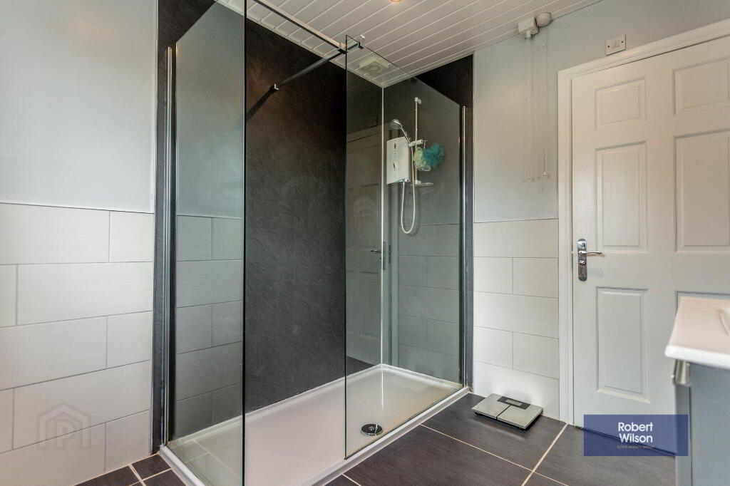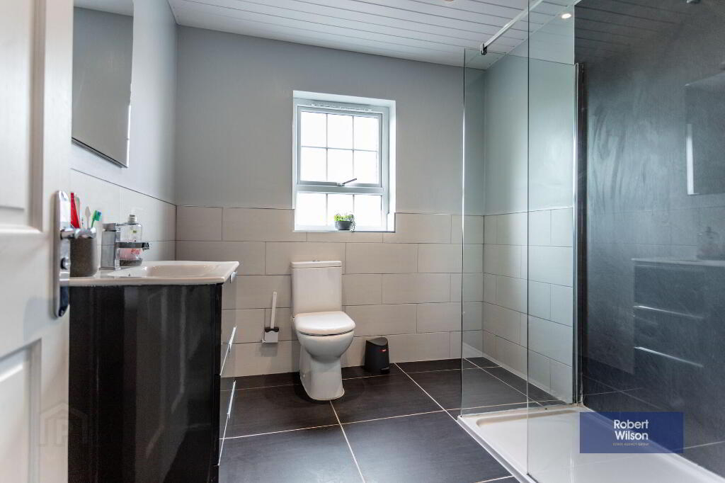 2.65m x 2.35m (8' 8" x 7' 9") White suite comprising; vanity incorporated wash hand basin with mixer tap, low flush w.c, large walk in shower cubicle with 'Mira- Sport' electric shower tiled floor, part tiled walls, chrome heated towel rail, extractor fan, PVC ceiling, recessed lighting.