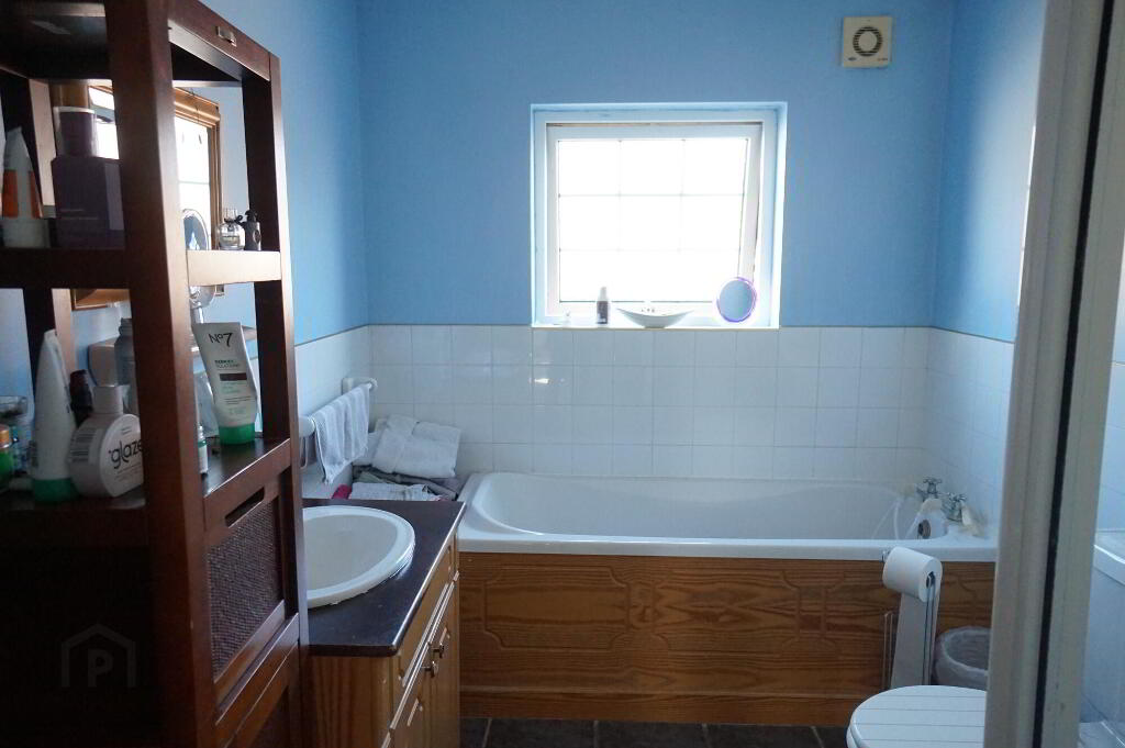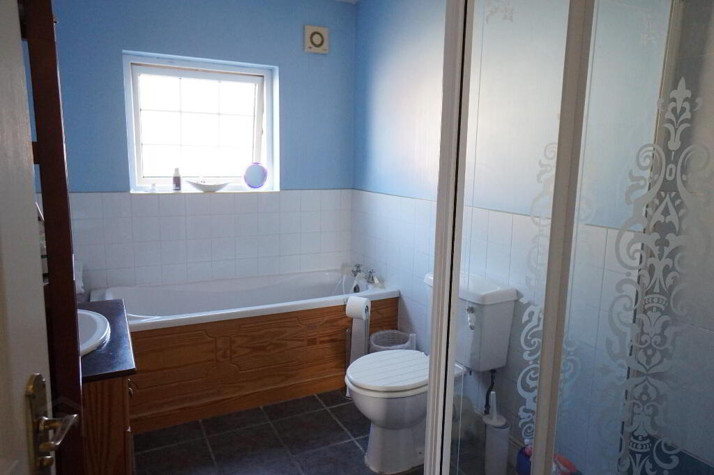 3.05m x 2.08m (10' 0" x 6' 10") White suite comprising; low flush w.c., panel bathtub, vanity incorporated wash hand basin, walk in shower cubicle with thermostatic valve, part tiled walls, tiled floor, extractor fan and single panel radiator.