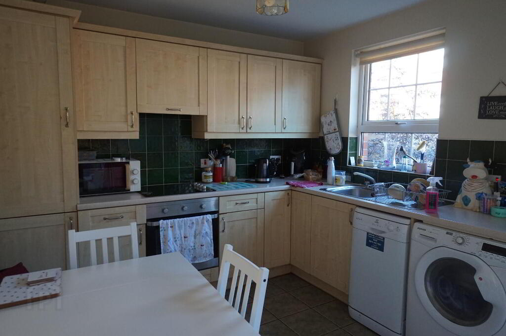 4.77m x 3.06m (15' 8" x 10' 0") Range of high and low level units, space for integrated fridge/freezer, small dishwasher, washing machine, stainless steel sink unit with mixer tap, laminate worktop, part tiled walls, tiled floor, French doors to rear garden.