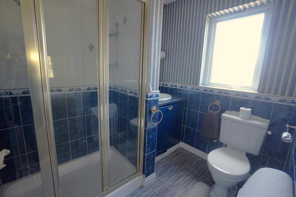 White suite comprising; low flush w.c., vanity incorporated wash hand basin, walk in shower cubicle, part tiled walls, recessed lighting, double panel radiator and extractor fan.