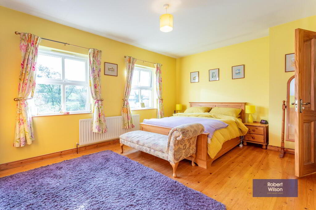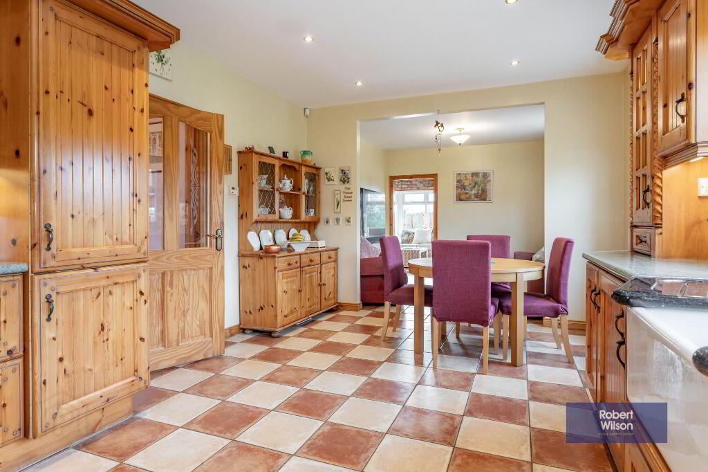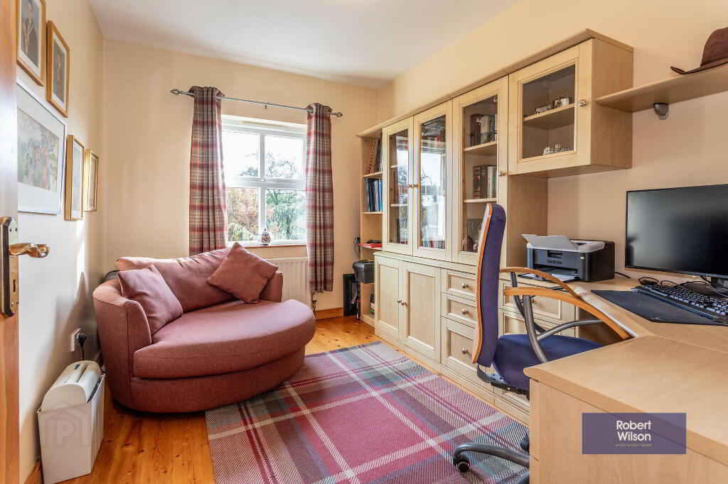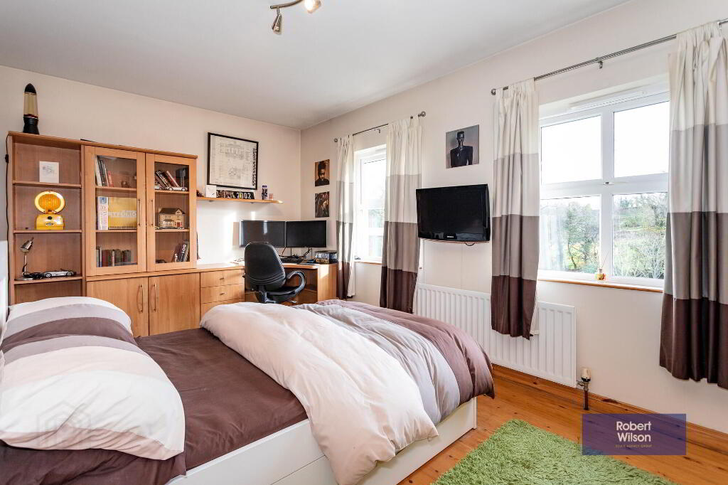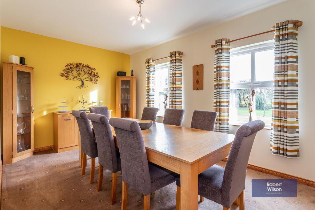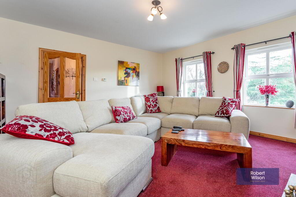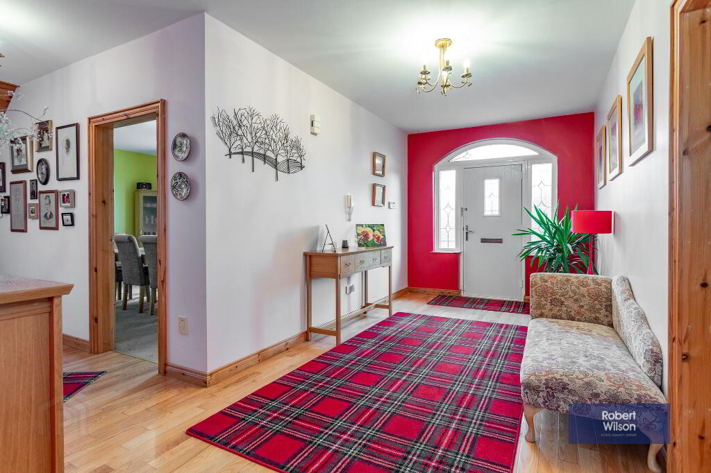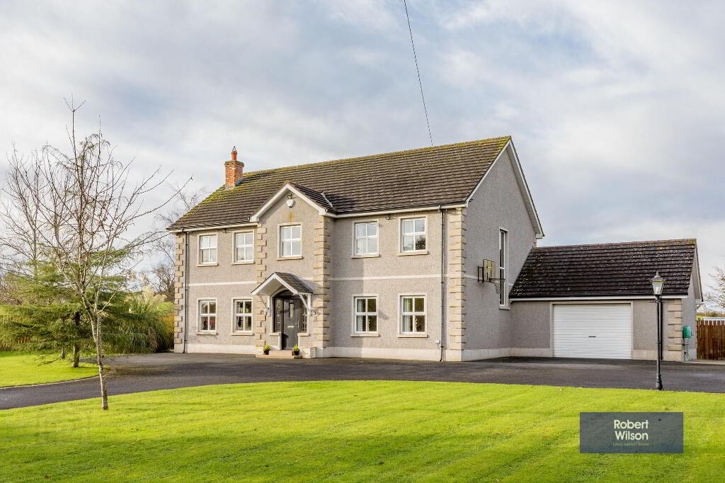 Nestled in a picturesque semi-rural setting near Moira and Dromore, this beautiful home offers spacious living on a generous plot. The ground floor has underfloor heating throughout and features a welcoming entrance hall with a stunning Cathedral window, lounge with a feature fireplace, and a bright sunroom opening onto a patio and decking area. A modern kitchen with a 'Rangemaster' stove and integrated appliances, a formal dining room, family room, utility, and downstairs W.C. complete the versatile ground floor layout. An integral double garage with roller door adds practicality.