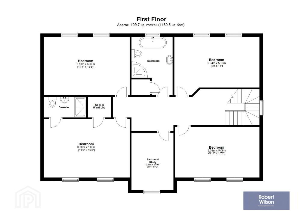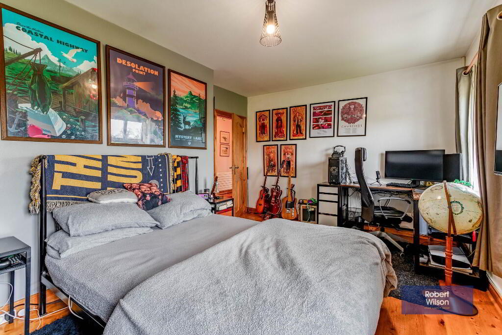 The first floor boasts five well-proportioned bedrooms, including a luxurious main bedroom with a walk-in wardrobe and en-suite. A family bathroom features a freestanding bathtub, walk-in shower, and contemporary finishes. Solid wood flooring runs throughout, adding warmth and character.