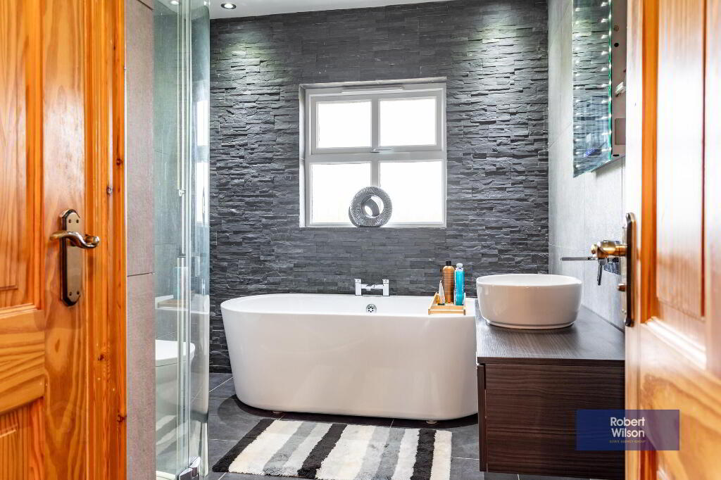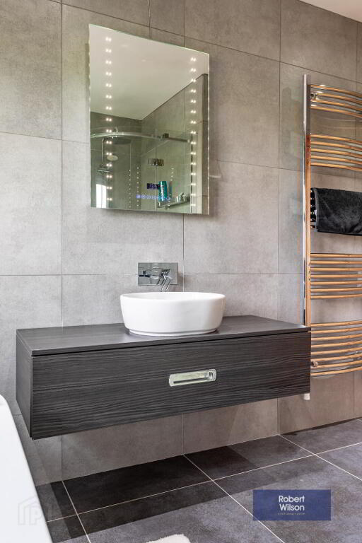Suite comprising; vanity incorporated wash hand basin with storage and mixer tap, low flush w.c. freestanding bath with mixer tap, walk in shower cubicle with thermostatic valve, rainfall and handheld fittings, fully tiled walls and floor, extractor fan, chrome heated towel rail, recessed lighting, hot press off.