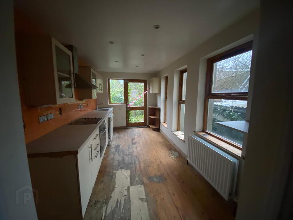 4.25m x 1.92m (13' 11" x 6' 4") Range of high and low level units, integrated hob oven, extractor fan over, space for dishwasher, fridge freezer, exposed floor boards, recessed lighting, door with glazing to rear garden.