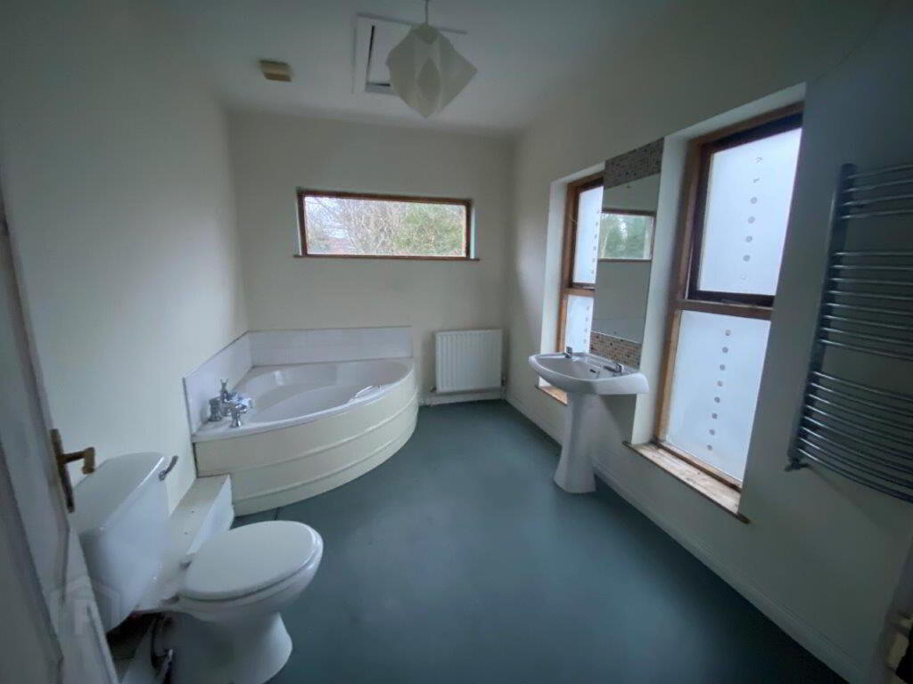 3.33m x 2.35m (10' 11" x 7' 9") White suite comprising; low flush wc, corner bath with telephone attachment, pedestal wash hand basin, walk in shower cubicle, access to loft, chrome heated towel rail, part tiled walls.